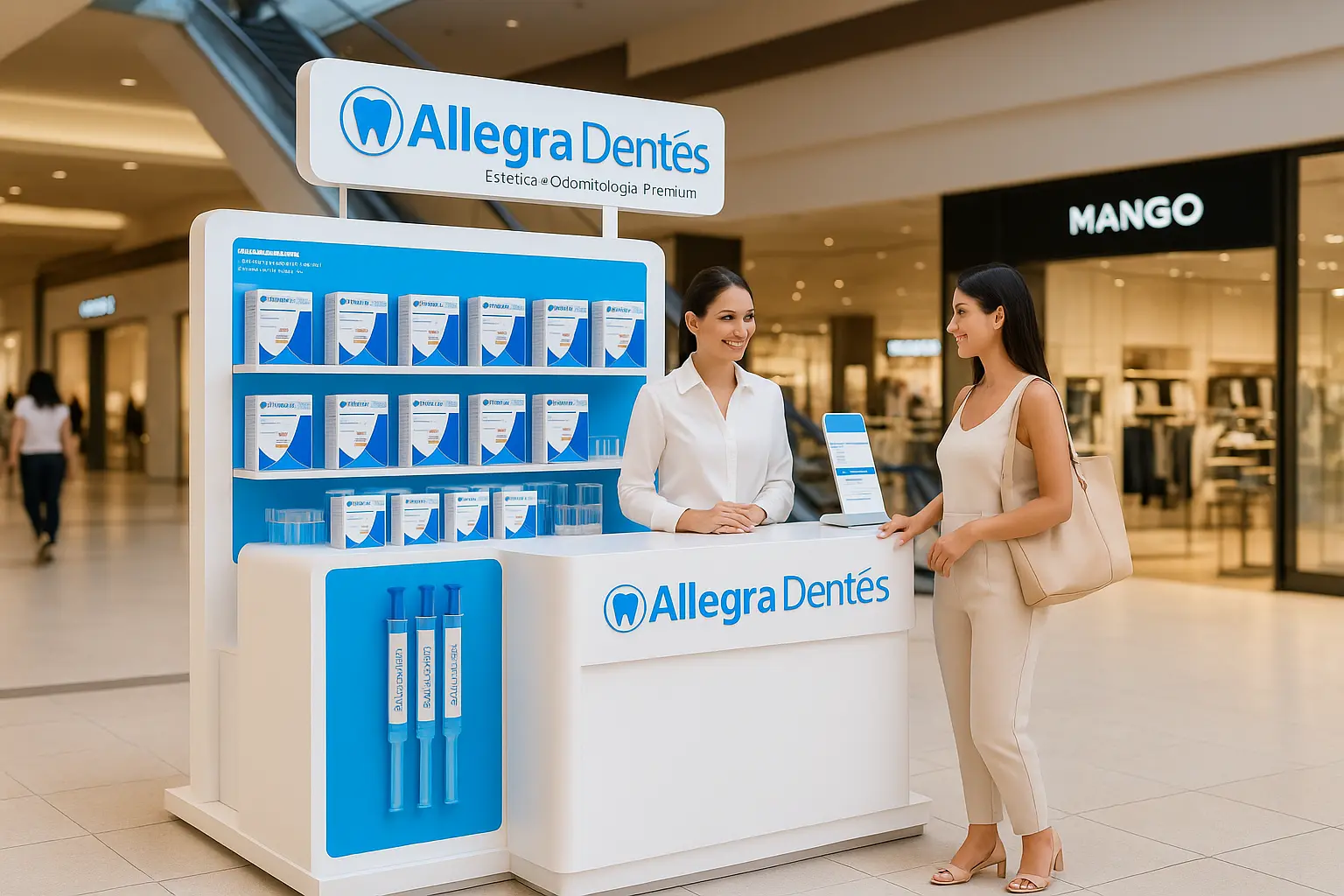 e prático para shoppings e centros comerciais. Estrutura atrativa para exposição e venda dos produtos Allegra Dentes.